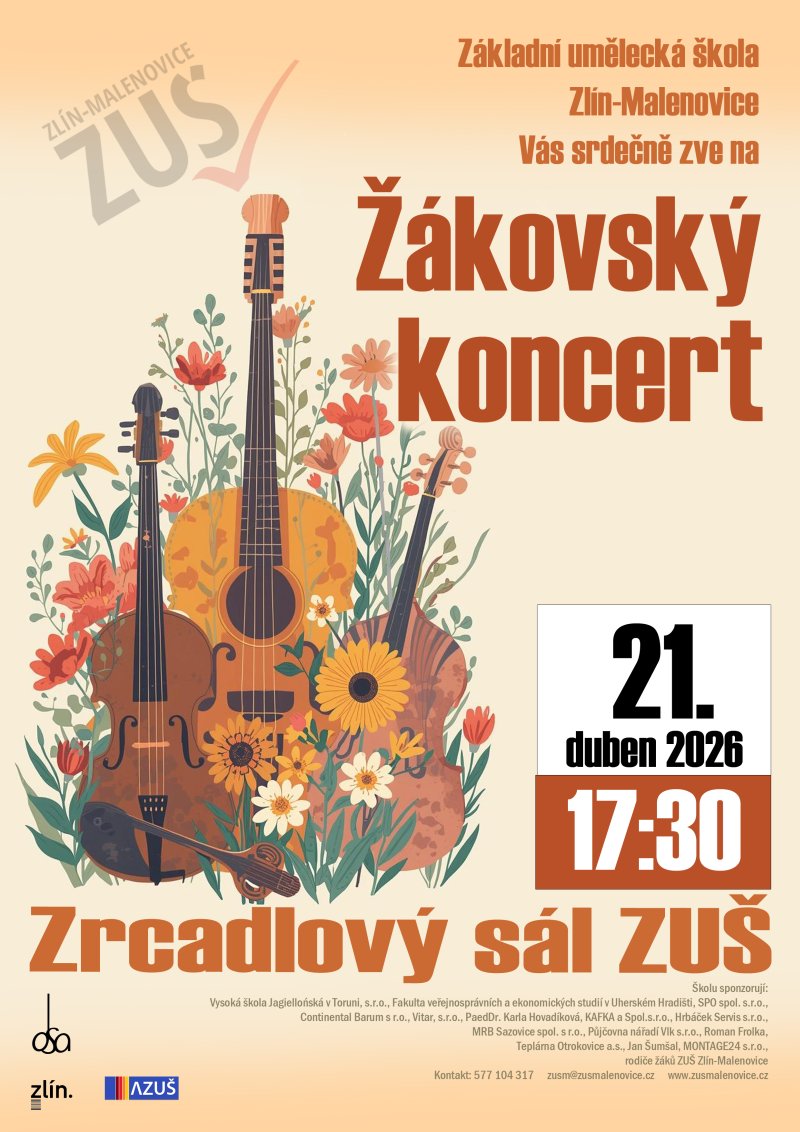 V úterý 21.dubna se v Zrcadlovém sále naší ZUŠ uskuteční tradiční Žákovský koncert. Začátek v 17:30 hodin.